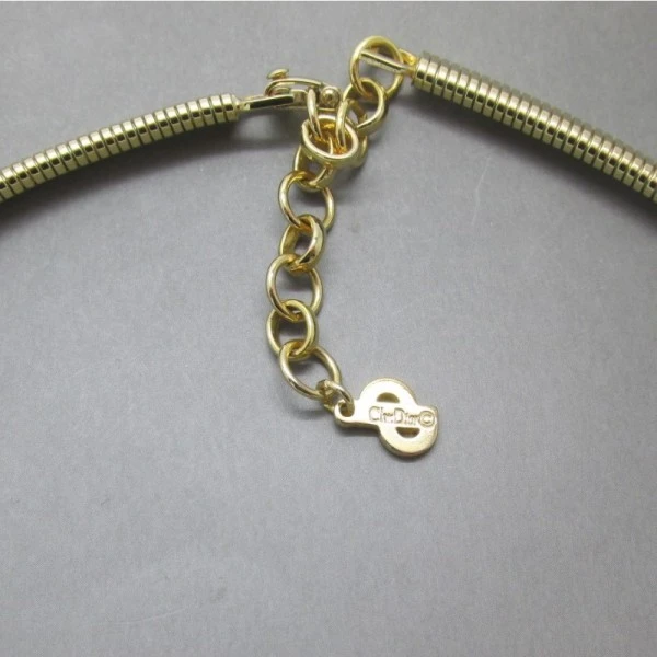 This is a stylish vintage Christian Dior necklace. The necklace has clear crystal details to the front with a gold tone finish to the rest of the necklace. The necklace has a flat gold tone chain a with a foldover clasp closure. The necklace chain has the CD logo and it is marked with CH Dior on the rear of the clasp. The necklace measures approximately 15 inches (38cm) but has a 2 inch extension chain allowing the necklace to extend to 17 (43cm) inches if required. The necklace is in excellent condition. Matching earrings can be found here .