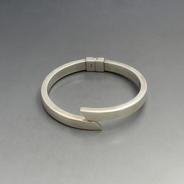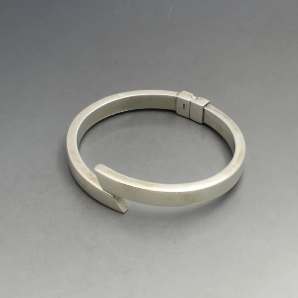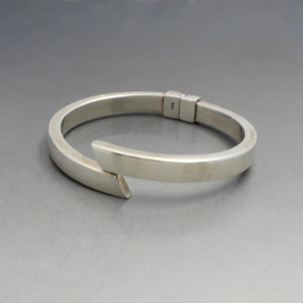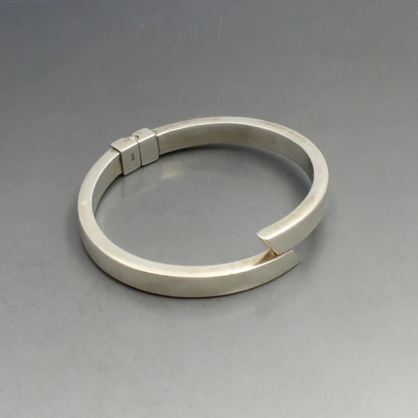 Vintage sleek sterling silver bangle. It is hingled and openable and is marked "925". It measures approximately 5.9 x 5.3 cm (clear internal dimensions) x 0.6 cm wide. Weight is 21 grams .It is in very good condition with small signs of wear commensurate with age.