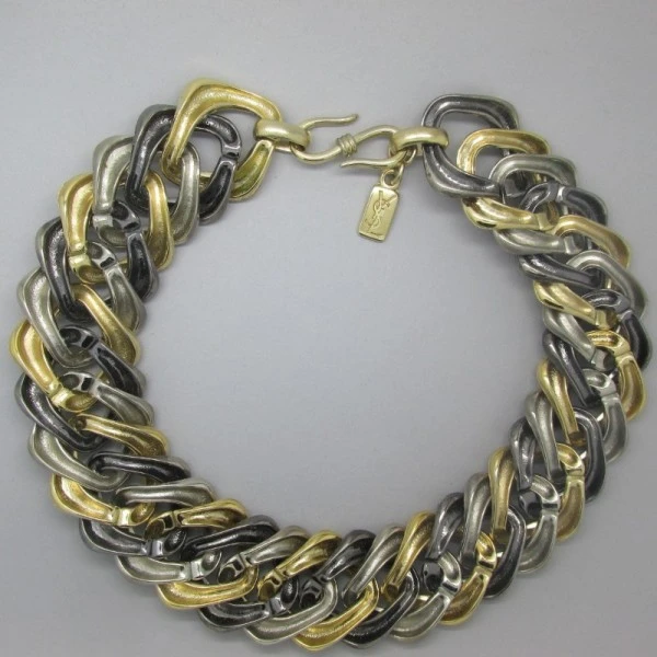 A stylish vintage YSL chain necklace. It comprises a series of goldtone and silvertone interlinking chain links. It is a round style necklace and has an S" type hook fastening. The necklace measures approximately 15.8 inches (40cm) long. The clasp of the necklace is marked with the "YSL" signature and the rear of the clasp is marked "Made in France". It is in very good vintage condition (almost unworn) with some very small signs of wear commensurate with age. It comes with the original black and gold YSL box which is in very good condition.