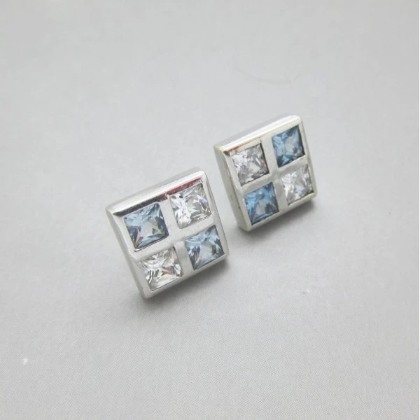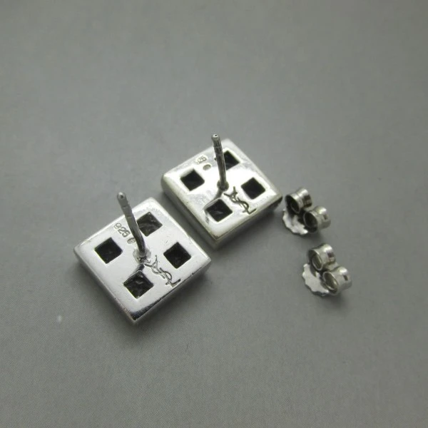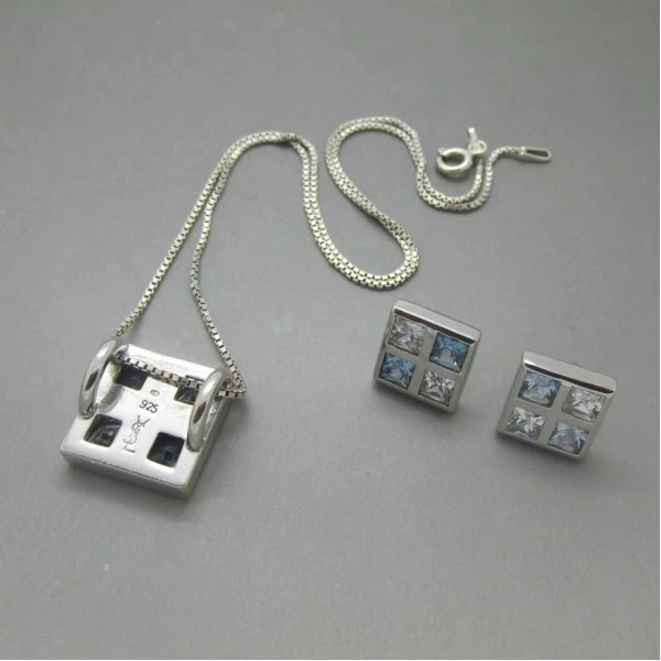 Lovely Yves Saint Laurent vintage pendant and earrings set. The pendant and earrings are made of sterling silver and comprise clear and aquamarine crystal details. The rear of the pendant and earrings are marked with "YSL" and "925 The sterling silver chain is not the original necklace chain and measures approximately 16 inches . The main pendant measures 1.4cm x 1.4 cm and the earrings each measure 1cm x 1cm approximately. The set is in excellent condition Condition: Excellent Colour/Gemstone: Crystals Metal: Sterling Silver Size: 16 inches chain (41cm) Era: 1990's