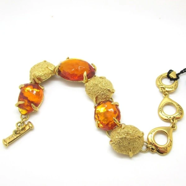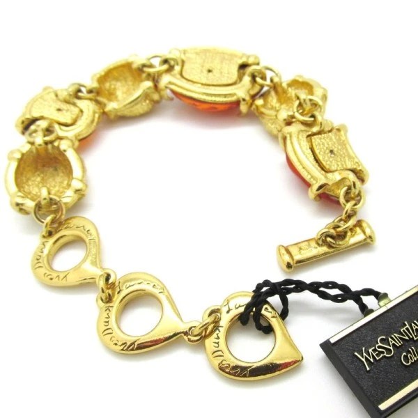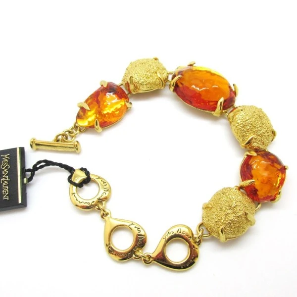 This stunning vintage bracelet by Yves Saint Laurent has orange resin cabochons and textured gold plated cabochons prong set in gold plated settings.The bracelet has a gold plated finish to the rear and has a toggle fastening. There are 3 heart shaped gold plated pieces to the bracelet near the toggle marked with the YSL logo and the toggle is also stamped with Made in France. There is also a black Yves Saint Laurent Collection tag attached to the bracelet. The bracelet measures approximately 9.06 inches (23 cm) and is in excellent unworn condition. The bracelet comes with a black rectangular Yves Saint Laurent box and is estimated to date from the 1980's.Condition: ExcellentColour/Gemstone: Gold/orangeMetal: Gold Plated Size: 9.06 inches (23 cm)Era: 1980's
